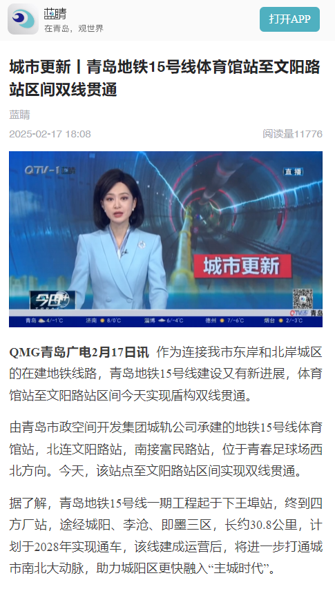 【藍(lán)睛】城市更新丨青島地鐵15號線體育館站至文陽路站區(qū)間雙線貫通