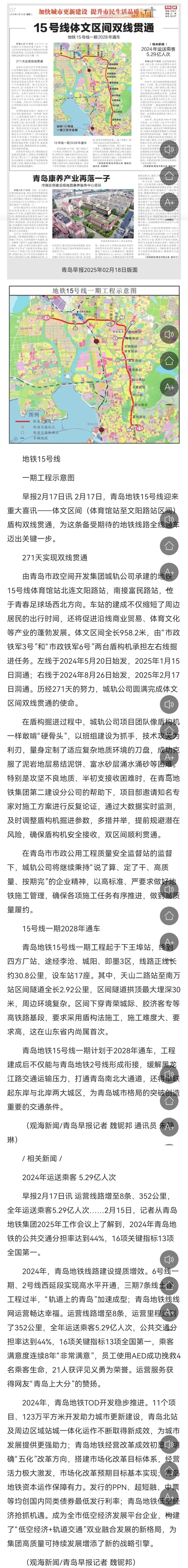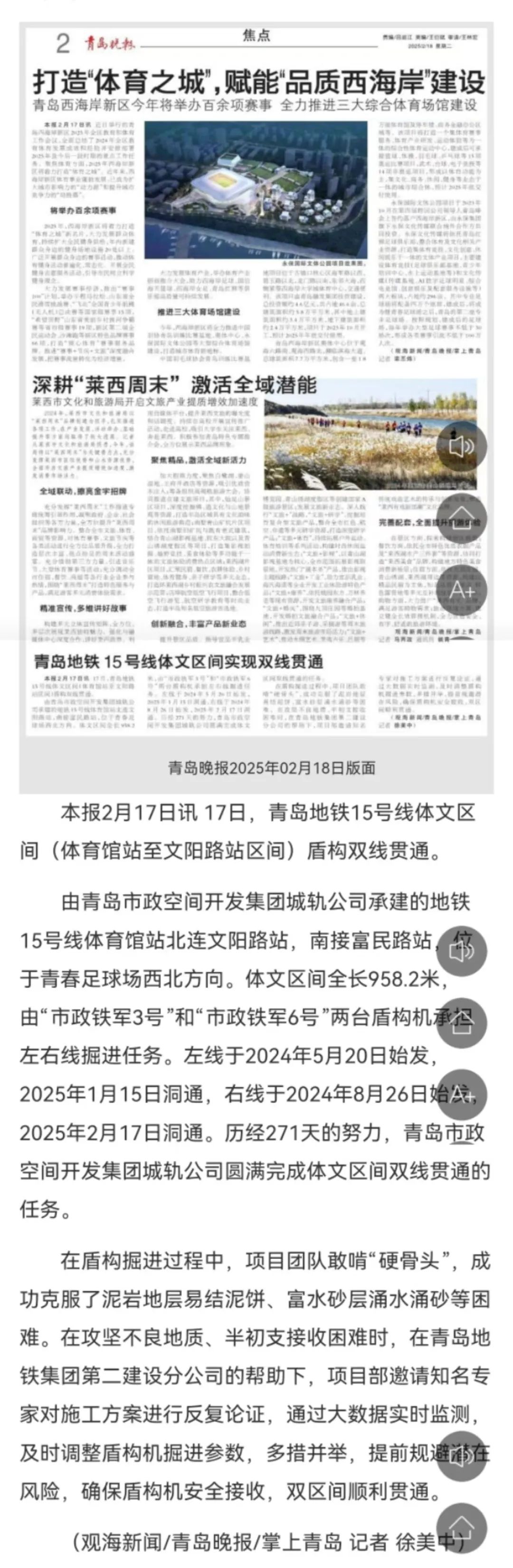 【青島晚報】青島地鐵15號線體文區(qū)間實現(xiàn)雙線貫通