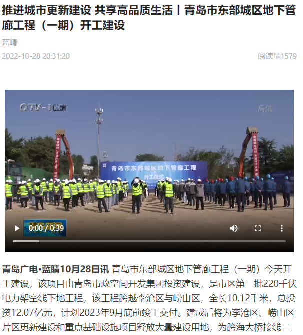 【青島新聞】推進城市更新建設 共享高品質生活丨青島市東部城區(qū)地下管廊工程(一期)開工建設