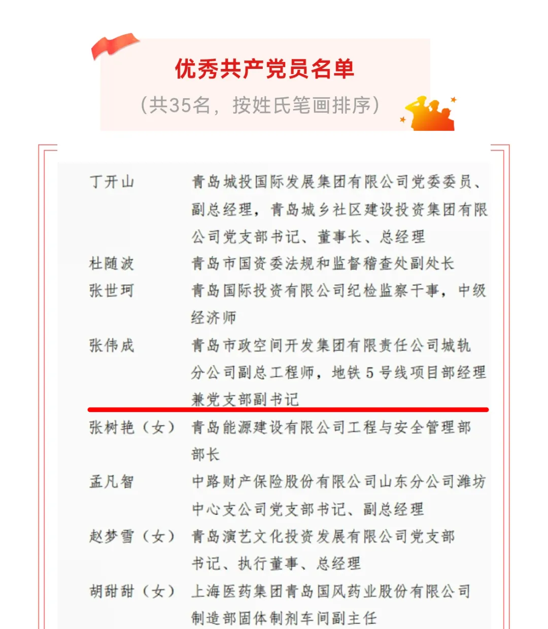 近日,集團捷報頻傳,第一市政吉林同志被中共青島市委評為“青島市優(yōu)秀黨務工作者”,城軌公司張偉成同志獲評青島市國資系統(tǒng)“優(yōu)秀共產黨員”,城建公司遼陽路項目部黨支部獲評青島市國資系統(tǒng)“先進基層黨組織”。