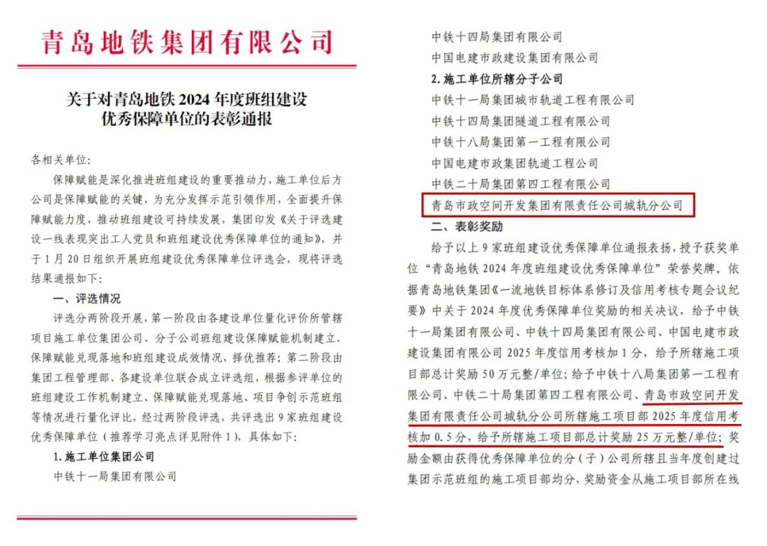 2月8日,市住建局通報表揚2024年度市政公用工程領(lǐng)域班組建設(shè)表現(xiàn)突出單位,城軌公司赫然在列;2月10日,城軌公司作為唯一一家非央企企業(yè)獲評“青島地鐵2024年度班組建設(shè)優(yōu)秀保障單位”(共6家)。